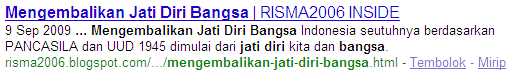 Mungkin anda pernah menemukan sebuah perbedaan Site Description pada Search Result. Yaitu perbedaan yang mencolok antara site description yang pernah anda berikan untuk website anda dengan site description hasil pencarian website pada datacenter Google. Seperti yang pernah saya temukan pada site description sebuah halaman pada Blog RISMA2006 INSIDE dengan title Mengembalikan Jati Diri Bangsa.